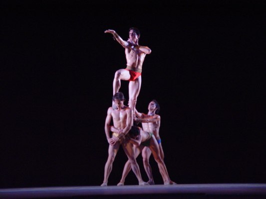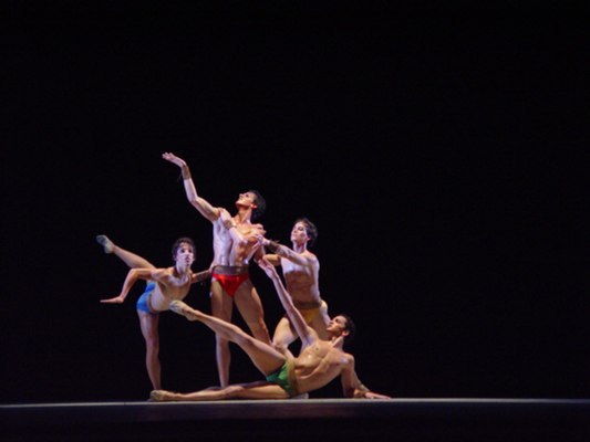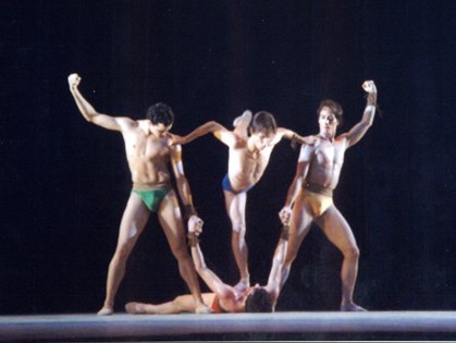 Canto Vital (Song of Nature): Music by Gustav Mahler (Rondo finale from the 5th Symphony in C); Choreography by Azari Plisetski; Costume Design by Salvador Fern·ndez; Performed by Miguel·ngel Blanco, as Nature, Joan Reyes, as Beast, Javier Torres, as Fish, and Daniel Sarabia as Bird. This is a contemporary piece for four male dancers and a vehicle for physicality and prowess, as they leap and crawl and climb, up and over and under each other, in bare, bathing-suit types of colorful costumes. This is a work of biceps and bravura, masculinity and muscularity. Mahler's music is perfectly positioned here, with its trumpet flares and swelling strings. Kudos to the Lighting Designer (not mentioned) and to Mr. Plisetski, the Choreographer.