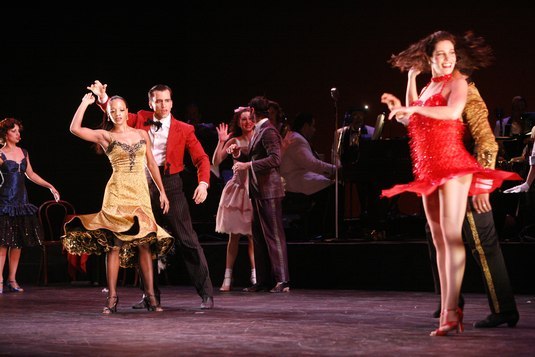 Sometimes the orchestra played on its own, as the dancers casually flirted at the bar tables, in Neil Patel's appropriate stage set. Throughout the evening, it seemed that this was a total trumpet fantasy, as all four trumpets seemed to dance on their own, wild and wooly. The four trombonists (one bass) and five saxophonists enhanced the all-that-brass bravura brilliance. Even a samba snuck in, as Sambia, by Mario Bauza, added a nod to Brazil, while Tanga Bolero turned the rhythm to undulating exoticism.