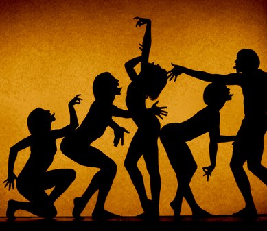 Much of the action takes place in silhouette with the dancers against the backlit backdrop. The poses are extreme, with flexed backs and with arms akimbo, fingers splayed wide apart or contorted. These silhouettes are very like those of Kara Walker, who teaches at Columbia University and whose work is now being shown at the Greg Krucera Gallery.