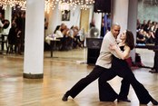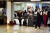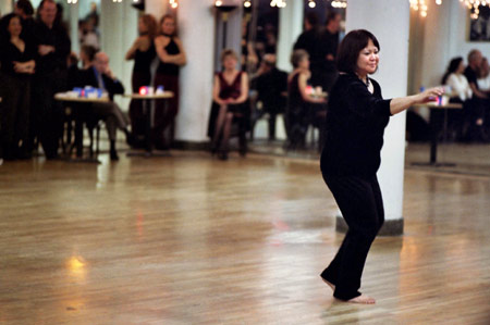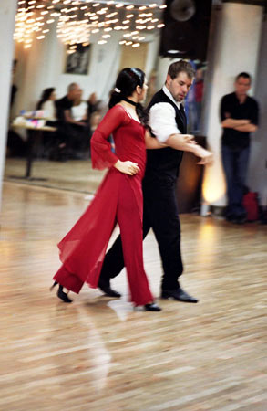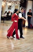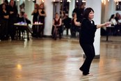 When the transformation was complete, with the lights lowered, the bar open, and the DJ spinning, people of all ages, shapes, and dance levels took the floor. While some people were coupled and others played the field, everyone seemed to be enjoying themselves. Not knowing exactly what to expect, I spent much of the time watching. I found that it was definitely a social scene-friends caught up with each other, and newcomers were introduced-but the primary objective of the evening was to dance. When I was asked to dance, my partners were friendly, but they usually meant business. I felt obligated to tell one man who asked me to dance the cha cha that I didn't have much experience with the style. Only when I assured him that I at least knew the basic steps, was he willing to proceed. In some ways, the atmosphere stirred up anxieties I once felt at high school dances, except that unlike high school where kids were usually asked to dance based on how cool or attractive they were, at the holiday dance party, people were usually asked to dance based on how polished their dancing skills. So, I gave several dance styles a shot, and then geared up to watch the scheduled performances.