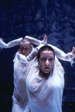 This trio is the choreographic masterpiece of the evening. It is here that the dark cassocks, the stark lighting, and the raging sound bring the audience into a new receptivity, a vulnerability, to the dance. The sound panics into heartbeat, then double and triple tempo heartbeat and the warning sounds of danger - wailing train whistles and running. The dancers gesture and stretch without reaching, they glance sidelong at each other and at the audience to see but turn away as if frightened that they see, they do not connect, they move together in carefully choreographed disorder, as if persecuted, they shrink into their hair shirts in fitfulness, and when separated, pound the stage with feet and heads. Here is the sleepless night, and anxiety-ridden midnight, the unsuccessful escape attempt of the somnambulent. It is uncomfortable to watch. It is unconstrained, revealing, courageous choreography and performance. The section ends with the wailing whistle, and dancers run into what seem to be the oncoming lights of a train.