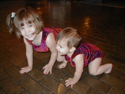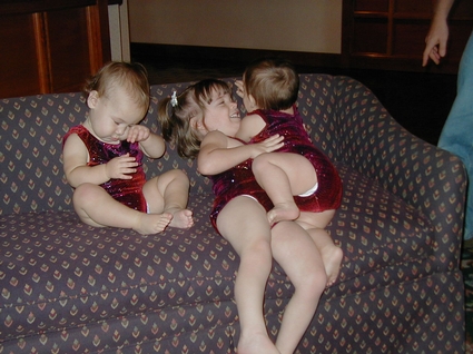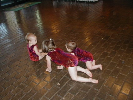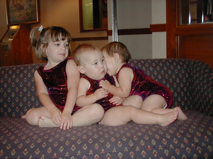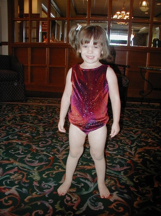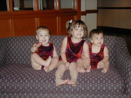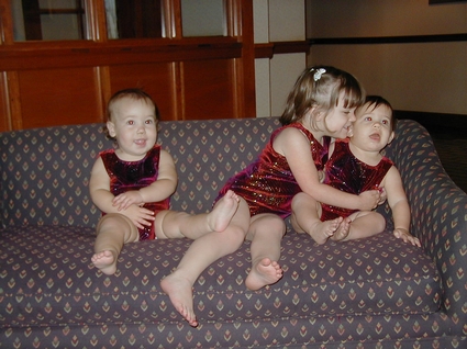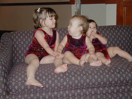 Danskin Burgundy velour leotards with golden swirls (Style 2041, $24.00), Medium for Taylor, Intermediate for Camille, and 6X for Haley.