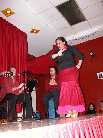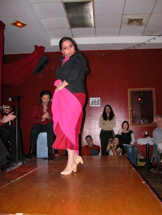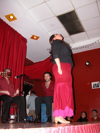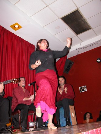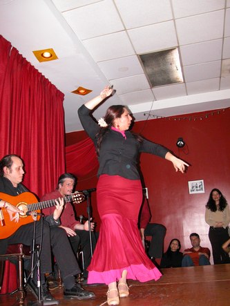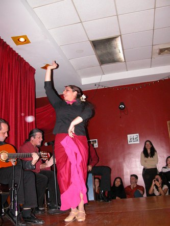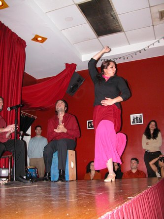 I had a chance to chat with Raquel Heredia at Alegrias after her performance. Ms. Heredia is a visiting artist from M·laga, Spain. She has her own dance company called Amangue, and has performed with the companies of Juan AndrÈs Maya and Los Habichuelas. She gave a passionate and energetic performance accompanied by Raphael Brunn, Cristian Puig and Peter Basil.
