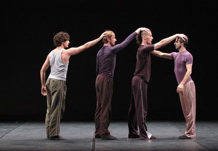The two 'pieces de resistance' are undoubtedly '(N.N.N.N.)' and 'One Flat Thing, reproduced'. The first is a wonderful quartet for four men (Cyril Baldy, Amancio Gonzalez, Georg Reischl, Ander Zabala) in which they pass gestures - a hand, an elbow, a knee or even a full body - from one to another. Every now and then all four of them land up with a hand placed on another's back, a formation which to Forsythe looked like the letter 'N' - hence the name of the piece.