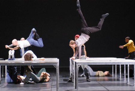 'One Flat Thing, reproduced' also brought the house down. Accompanied, in this case, by pounding rhythms, and performed between, on top of, under and around 20 cafeteria type tables, this was some finale. Each performer did something so fascinating that one wished to follow only him or her at any one time - except that there was too much else going on at the same time.