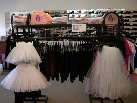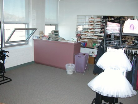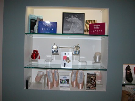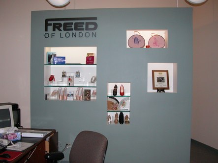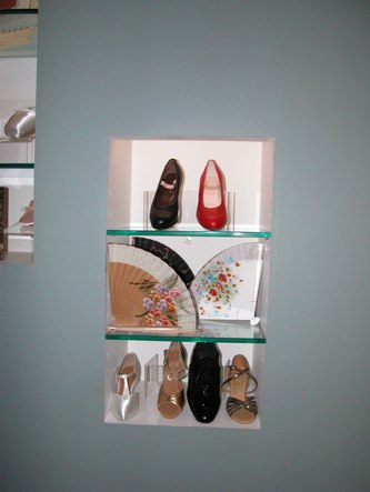 Freed's space begins with a pleasantly lit reception area staffed by Angela. A display of shoes, Spanish fans, books and other items is behind her. After the reception area is the showroom. One wall is lined with many shoes. There are several racks of clothing, a small wooden floor on which to test shoes out, and a changing area.