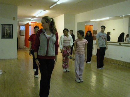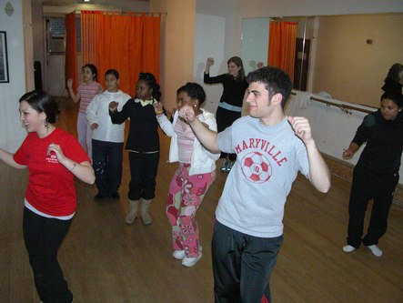 Two hundred kids take classes at Groove With Me taught by 21 volunteer teachers. Abby Rosin, the founder, often teaches classes. Meredith Sherman, the program director, is a social worker by training. One of Groove With Me's teachers is Ashley Tuttle of ABT and Movin' Out. Most of their students live in East Harlem with a few coming from elsewhere. They also have a class on the Lower East Side since that is where the program started before they got their own studio space. The space is about 1400 square feet in one long room, plus offices.