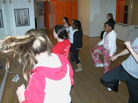 Groove With Me, a dance studio offering Ballet, Hip Hop, tap, jazz, funk, theatre and movement, teaches free dance classes to kids in Harlem. The studio has a nice smooth wood floor. When I visited a group of college students from Vanderbilt University were there on an alternative spring break. They had just finished painting the studio and were about to teach a hip hop class to a group of 10-12 year old girls. This class is called "Who am I?" and combines dance instruction with discussion of life issues. Today the topic was nutrition.