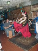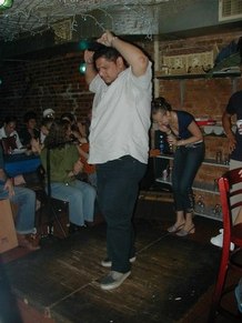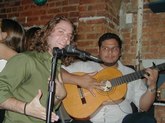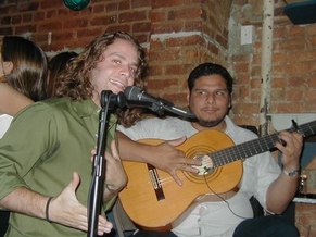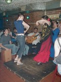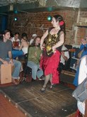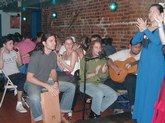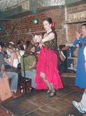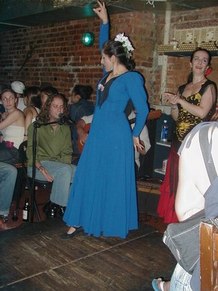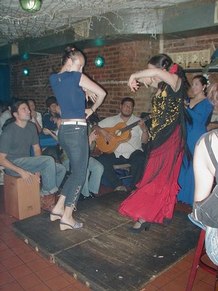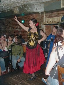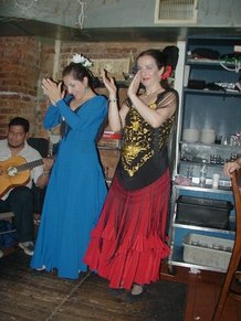 August 5, 2002, with Gisele Revollar, at Le Rendez Vous CafČ, 212.265.2233, 739 8th Avenue, btw. 46th and 47th Streets, while her Flamenco Guitarist husband, Carlos Revollar, and Nelida Tirado, Flamenco teacher, and many of the Flamenco students stop by to quench enormous thirsts, following the high energy Flamenco class in a very warm, fourth floor walkup studio.