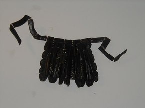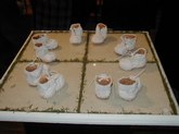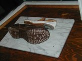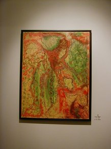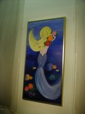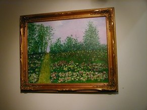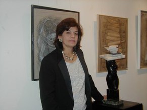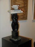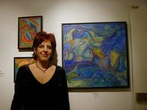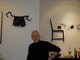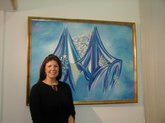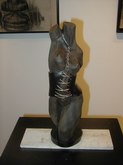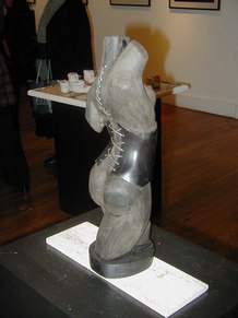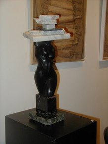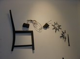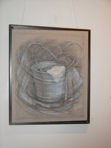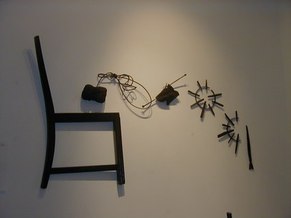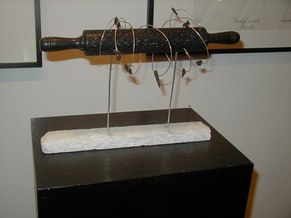 Jacqueline Maggi, from Cuba, paints and sculpts with a feminist and earthy sense of emotions, a love of nature, and a social conscience. Her "Torso", all sewn up, back and front, tells about the needs of a woman to reconstruct herself, to regain wholeness. The wooden sculptures of children's shoes, on tiles, tells of the capacity of peace, as children make a circle in the midst of dissention. The torso on a pedestal, with marble weights on top, tells of the amusement and the abuse by men, who put women on a pedestal and then heap onto them dead weight. The apron tells of an article used by women around the waist. The rolling pin shows flies around it, on wire. The wall installation shows the woman's chair, her knitting, her painting, and her cooking. The painted bucket has a bit of lace, to show beauty in the simplest of objects. The woman's and man's shoes, carved from wood, symbolize togetherness.