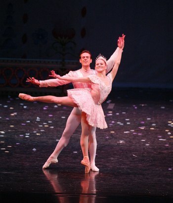 Presiding over the sweets and flowers are Julianne Kepley, the Sugar Plum Fairy, and Michael Levine, the Nutcracker Prince. They were a wonderful pair both apart and together. The smile which brightened the stage was no less an integral part of Ms. Kepley's presence than the blinding turns she executed with abandon during her solo. Mr. Levine's bravura solo work showed off this dancer to great advantage, but shone especially when he partnered Ms. Kepley. As a heartbreakingly lyrical violin played, they danced their grand pas de deux with a trust and generosity that was palpable. Ms. Kepley later told me how much she enjoyed this partnership because each performance allowed her to, "...look forward to new discoveries when you have someone you really like." It showed.