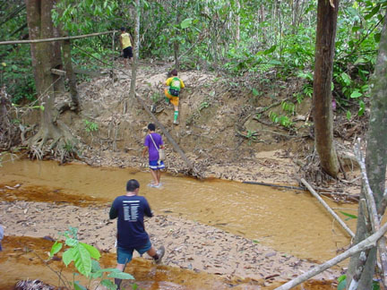 I often wonder if the locals take all this natural beauty for granted; that waterfall break looked like something out of a movie. After the waterfall, the trail continued up a steep mountain, so my group, (the slow pokes) decided to cheat and use a shortcut, as one of the guys knew the way!! Of course we had to pay for it later with a "down-down"... chugging a mixture of beer and sprite...in the center of the "circle" while sitting on a block of ice!! 1/15/05 "... most of the above -river crossings were on picturesque log bridges that to my relief had flimsy hand-holds...which only helped psychologically, as I know they wouldn't have held me if I slipped. I was doing fine until we to came the l-o-n-g-e-s-t expanse to cross, and also VERY high over the river, with nothing to hold on to. Everyone ahead of me made it across lickety-split. Although my jungle brain knew it was wide enough for me to have maintained my balance, my city brain made me freeze. It was a long way to the other side and an even longer drop down, and I didn't trust myself.