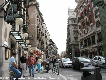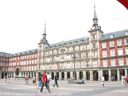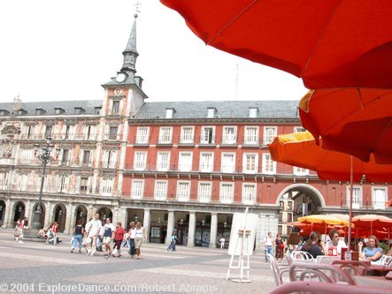 Madrid has the street energy of New York, the late night festiveness of Montreal, the scale of Brooklyn (maybe plus a little) and the sunshine of California. Madrid's street plan is medieval, with narrow streets running off in all directions. The architecture is very pleasing, with a bare minimum of the sort of Bauhaus monotony you find elsewhere. With a map and a little bit of wandering, I was able to feel reasonably comfortable getting around on foot. To ensure widespread aimless walking with a purpose, just set out to find someone who knows where to go for Paso Doble. Finding Flamenco is easy. One tourist guide lists eight restaurants offering dinner and a Flamenco show, plus at least three theatres offering Flamenco shows at various times. Paso Doble, on the other hand, is surprisingly difficult to find. I have always assumed that people danced Paso Doble socially in Spain since this is where the dance is from. I don't think the concierge at my hotel had ever been asked about Paso Doble, to judge from the expression on his face. He did have a suggestion of a place, but when I wandered over there during the day, it was clearly a Disco so the likelihood that anyone would be dancing Paso Doble (or any other partner dance for that matter) is probably slim. I wandered down to Torres Bermejas, the Flamenco place the concierge had recommended for later that night. Across the street I found Madrid's Menkes store. New York has a Menkes across the street from Dance New York. That store is Flamenco only. Madrid's Menkes has Flamenco dresses and shoes, as well as ballet shoes, Danskin tights, and a generous range of items that in the US would be found in a Halloween costume and party store. Even they weren't sure where to find Paso Doble, but they did suggest the tourist information office in the Plaza Mayor. This was an excellent suggestion. Not only is the Plaza Mayor an architectural gem with numerous outdoor cafes lining its interior, but the people in the tourist information office are very helpful. They found information on a Paso Doble show and a venue that may have Paso Doble among other social dances (a place called Golden at the Plaza de los Cubos starting at 11 pm, but I didn't ever make it there). They were, though, of the opinion that it was the sort of thing only older people would be doing. Perhaps Paso Doble is the Spanish equivalent of Cha-cha: younger people think of it as their parents' dance. I have only taken Paso Doble lessons maybe twice, so it is not like I could join in if I found it, but when in Madrid... I then asked them about Swing dance in Madrid, and that stumped them. I tried to demonstrate the difference between East Coast Swing and West Coast Swing, but they couldn't picture it. Next time I will have to bring some music.