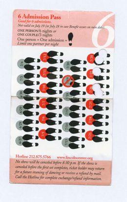 The point of this story, other than being an excuse to show you what the little blue ticket looked like, was this. If I had been successful in getting a ticket for the platform. Either by being organized and buying a season pass, or by being organized and getting to Lincoln Center early enough to actually get a ticket for the lesson, or by buying a punch from a season ticket punch scalper who actually had a punch to sell, I probably would have been up on the platform, crammed into the space, maybe having someone to dance with, maybe not. And I probably would have not run into my friends.