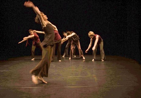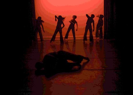 Let's start at the beginning. Five women are lying on the ground. They arch their backs. They arch their backs in canon (meaning they repeat the same movement in sequence offset from each other). Part by part they release from their supine position. They stretch their arms. They lift their legs. (One woman walks in from the back of the stage.) They spin on the ground. They roll over. The five women on the ground have some speed but the woman walking forward is moving very slowly. This makes for a good contrast of levels. The women on the ground now leap and finally pull the standing woman down to the ground.