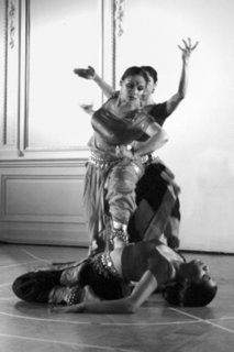 In act III, Nayikas performed a jazzy take on Odissi entitled Glow. The three dancers were dressed in simple shirt and pants outfits. They used flowing movements set to words floating on the screen that celebrate the contradictory nature of the South Asian woman (although I suspect it doesn't have to be limited to women of South Asian descent, the themes being somewhat universal). The dancers' postures were evocative of classical Odissi, but were somewhat softer.