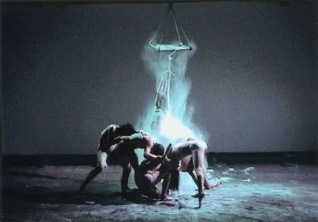 The final work, Traces, combined sound and movement in compelling ways. The floor was covered with what at the time I thought was sand (it later turned out to be flour), so as the dancers moved across the floor, they made scraping sounds. The sound of their feet was complemented by heavy exhaling. Their movements kicked the flour up into the air. If you imagined that the flour was ashes, it looked a little like a funeral. There was a flour sifter device suspended in the middle of the stage. Periodically, a dancer would stand under it and pull a cord, releasing a shower of flour into her hair and body, which would then be cast this way and that as she danced. I got the distinct impression that this is what bread feels like as it is being made.