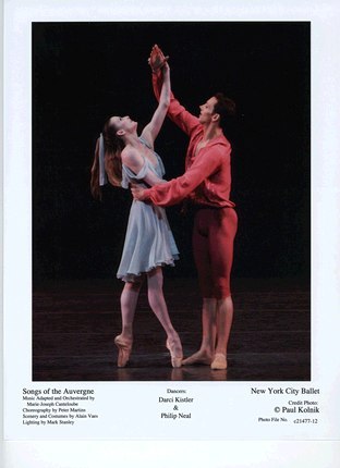 Songs of the Auvergne (Revival, 1986): Music Adapted and Orchestrated by Marie-Joseph Canteloube, Choreography by Peter Martins, Scenery and Costumes by Alain Vaes, Original Lighting by Ronald Bates, Lighting by Mark Stanley, Soprano: Lucy Schaufer, Performed by Rachel Rutherford, Kristin Sloan, Seth Orza, Jonathan Stafford, Megan Fairchild, and the Company. Auvergne is a region in France with bucolic pastures, meadows, and springs. The five series of folk songs are sung in langue d'oc, an early language of Latin and Celtic origin. These songs can hold their own or be presented in full orchestral arrangement. Award-winning soprano, Lucy Schaufer, has performed with opera companies world-wide, as well as The New York Festival of Song. (NYCB Notes)
