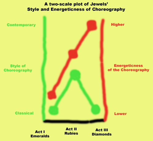 At the beginning of this review I wrote that the macro-structure might not be apparent on first glance. This is largely because the macro-structure of each act taken separately is not that strong, other than a build up to the finale of each act. The macro-structure becomes apparent as one looks at the pattern of the style and energeticness of the choreography across the acts. The macro-structure is emergent. As someone who is always looking for the macro-structure in a ballet, I think this is clear evidence that the choreography of Jewels is both sophisticated and masterful. For those of you who are visually inclined, Paul Kolnik's photos below encapsulate the entire ballet in three photos. For those of you who are mathematically inclined, I drew a chart that summarizes my view of this ballet's elegant choreography. (The pun is intended, since the ballet can be shown to be both visually and mathematically elegant.)