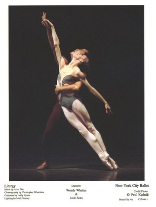 Liturgy (2003): Music by Arvo P”rt (Fratres, for Violin, Strings, and Percussion), Choreography by Christopher Wheeldon, Costumes by Holly Hynes, Lighting by Mark Stanley, Conductor: Andrea Quinn, Violin Soloist: Kurt Nikkanen, Performed by Wendy Whelan and Jock Soto. Part's composition is "inspired by the vision of a solemn procession of medieval monks...by candlelight...". (NYCB Notes).