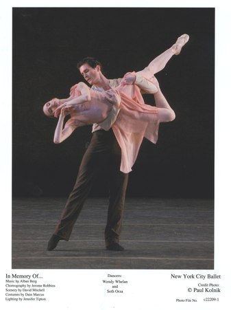 In Memory of...(1985): Music by Alban Berg, Choreography by Jerome Robbins, Scenery by David Mitchell, Costumes by Dain Marcus, Lighting by Jennifer Tipton, Conductor: Maurice Kaplow, Solo Violinist: Kurt Nikkanen, Performed by Wendy Whelan, Charles Askegard, Seth Orza, and the Company. Berg's violin concerto was written in tribute to the late daughter of a friend, "dedicated to an angel". The music is divided into three sections, depicting her life, her illness, and her "transfiguration".