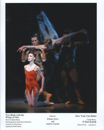 Two Birds with the Wings of One (2006): Music by Bright Sheng (Two Poems from the Sung Dynasty and "Chi Lin's Dance" from Flute Moon), Choreography by Jean-Pierre Bonnefoux, Costumes by Holly Hynes, Lighting by Mark Stanley, Guest Conductor: Bright Sheng, Soprano: Lauren Flanagan, Performed by Sofiane Sylve, Andrew Veyette, and the Company. Bright Sheng is the new Composer in Residence. Bright Sheng is a composer, conductor, artistic advisor, concert pianist, and advisor to Yo-Yo Ma's Silk Road Project. (NYCB Notes). (See an Interview with Bright Sheng).