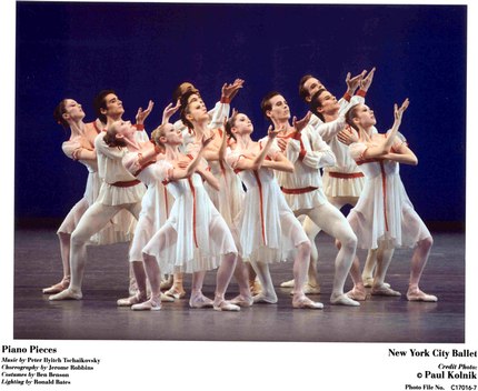 Piano Pieces (1981): Music by Peter Ilyitch Tschaikovsky, Choreography by Jerome Robbins, Costumes by Ben Benson, Lighting by Ronald Bates, Piano: Cameron Grant, Performed by Benjamin Millepied, Jennie Somogyi, Jared Angle, Alexandra Ansanelli, SÈbastien Marcovici, Maria Kowroski, Stephen Hanna, and the Company. Mr. Grant handled this entire work with poise and aplomb. Mr. Robbins was brilliant to choose these numerous piano pieces by Tschaikovsky, which are totally Russian in flavor and style. With white costumes and a blue-sky backdrop, the entire cast, including many members of the Corps, presented an upbeat and buoyant display, with a Troika, a Waltz, a Mazurka, a Barcarolle, and a few Polkas. These were dances within a dance, a fusion of Ballroom and Ballet, a production characteristic of a culture and a nation. Kudos to Mr. Cameron and to Jerome Robbins.