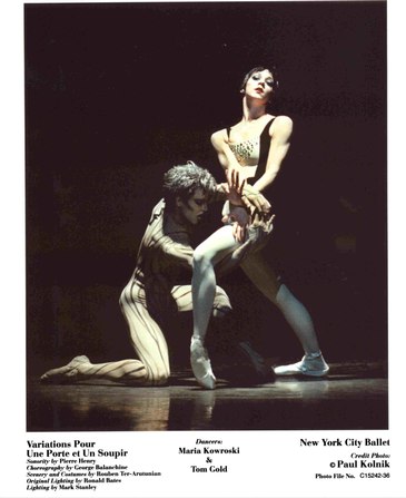 Variations Pour Une Porte et Un Soupir (1974): Sonority by Pierre Henry, Choreography by George Balanchine, Scenery and costumes by Rouben Ter-Arutunian, Original Lighting by Ronald Bates, Lighting by Mark Stanley, Performed by Maria Kowroski and Tom Gold. I have thoroughly enjoyed the entire Season of the New York City Ballet. This particular ballet was not enjoyable. In fact, for the first time, I was extremely anxious and impatient, due to the grating and grinding electro-acoustical score by Mr. Henry. It sounded like hammers, squeaking doors, creaking floors, and subway noises. This piece could possibly be re-mounted with a new score, as the sets are brilliant and the dancing was even more brilliant, but not enjoyable, as the "sonority" wore on my nerves. I can imagine this ballet with a wild score from Piazzolla, or Otero, or Binelli/Ferman (See Review, Argentine Consulate and See Interview).