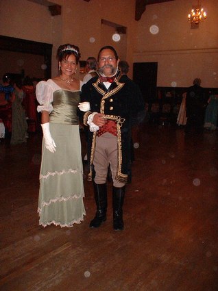 I left any contact with the present behind as I entered the hall. It was indeed like walking into the past. Everyone was dressed to the hilt in period garb. Ladies donned a rainbow assortment of gowns with high Empire waists, low bustlines, and short puffed sleeves. The fabrics were rich with embellished gold stripes, lace, floral designs, or sari prints (the influence of India on British fashion of this period). Their hair was styled in extravagant updos with headbands of ribbon, ornaments of flowers, feathers, and beads, and curly tendrils spilling out in the front or on the sides. They wore flat slipper shoes on their feet, long gloves on their hands, and cascades of gems around their necks. The final touch: a fan, waved seductively at opportune times. Most of the men sported knickers and high socks, boots, coats with tails, vests, and shirts whose ruffles peeked out at the neck and out of their jacket cuffs. Others came in full vintage military regalia.