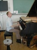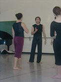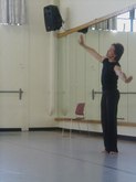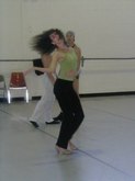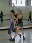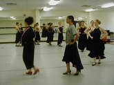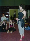June 18, 2003, Flamenco Class, Level II: Sara Erde, Teacher, and Carl Landa, Percussionist and Palmera (Claps). The students, all in black ruffled, long skirts, stamp on the floor, as Sara counts, "12, 1, 2, 7, 8, 9, 10, 11, 12...." The students are their own palmeras, clapping their hands over their heads, as if they might have used castanets. The CD being played had the beat of clapping, and the students danced in rhythm and in counter-pointe technique, with heel-toe work, followed by the recorded accompaniment. I saw one student stay to the side, just practicing the clapping rhythms. Students clearly were enraptured by Sara and by their Flamenco experience.