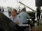He said, "Have the feeling....somebody is holding you here." He then led tumbling and stretching combos, to the well coordinated, percussive melody of Native American chants from Carl's piano. Pedro moved his dancers to the corner of the room, where they swept in lines of dancers from one side of the dance space to the other. I should mention the vast and well-lit dance spaces at the Skidmore Dance Center, which provided such comfort to all the Summer Dance projects and performances. When students danced to Pedro's arabesques, Carl played the harmonic instrument.