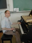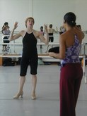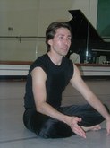 June 17, 2003, Pedro Ruiz Master Class: Pedro led a large group of students and advanced participants, with Carl Landa on piano and very interesting instruments, including one like a tiny piano, with a mouthpiece, and a large tambourine for the foot. There was a Mid-Eastern feel to the sound of this music, almost Egyptian or Arabian. In fact, Carl sounded like an entire band. There were about 15 participants, with only one male dancer. Pedro began with a very slow piece, which sounded like an exotic version of Satie. Stretching, reaching, head twists, and yoga-like movement enabled the students to relax and warm up. Pedro was extremely supportive and provided the quintessential role model of a Master teacher.