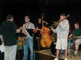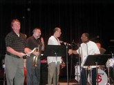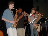 Faculty Sextet, Bernhard Theater, July 10, 2003: List of Performance Pieces - The Clan, Ambienz, Nice and Easy, Erica, Duo, Mello Tone, Liv.4U, Star Eyes, Strike Up the Band, Encore. This was an extremely well coordinated event, with the renowned Band members receiving tremendous audience accolades and encore calls. These musicians had been in residence with each other, on Skidmore's rustic Campus for almost two weeks, at this point, and, as a result, there were some liberties taken with extended riffs and improvisations, to the surprise, sometimes, of the other band members. Yet, these were positive and polished gestures that lent a smoothness and excitement to this concert.