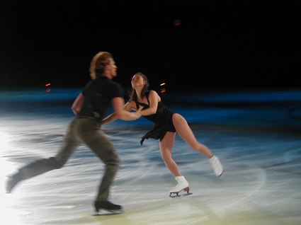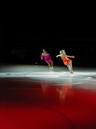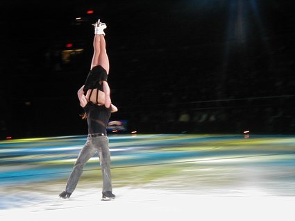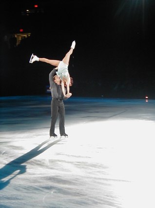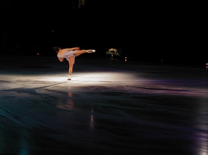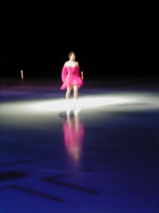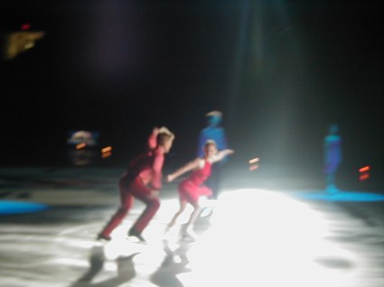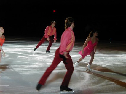 Tonight's recorded music was heralded with Grofe's Sunrise - Grand Canyon Suite, and introduced with Glenn Miller's In the Mood, as Scott Hamilton, ever vital and vibrant, danced a sexy, snappy solo, landing on his knees more than once. Yuka Sato danced to Misty with deep purple lighting effects and smooth and graceful dancing. Jamie SalÈ and David Pelletier danced a duet to Come Away with Me that had upside down skating and lightning fast spins. Todd Eldridge danced a powerful Flamenco and world-renowned, Oksana Baiul, of Russian origin, danced to Tchaikovsky's Swan Lake with an ethereal and elegant quality, as always. Alexei Yagudin danced a sensational solo, Memorial, exuding pathos and poignancy, as well as power and possession. To complete Act I, TGIF, an uplifting work for the entire cast, included train whistles, bullfights, black pants, and brilliantly colored blazers. The choreography was expansive and electric, as the ice dancers catapulted their bodies in aerobic fashion, as if the ice were merely a dance floor. This was truly impressive.