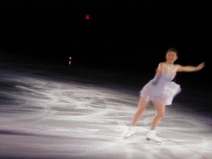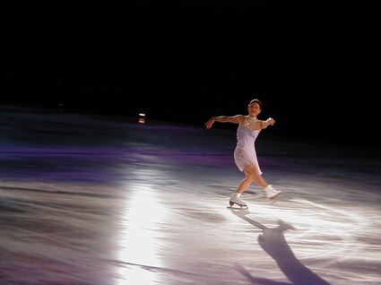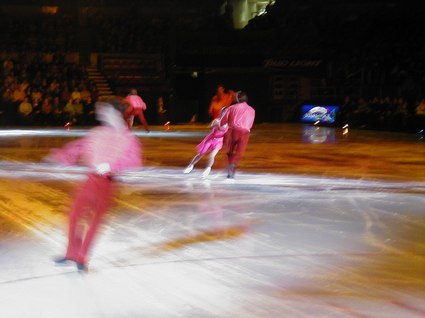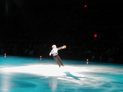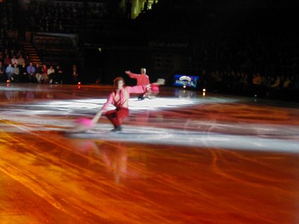 The world-renowned Kristi Yamaguchi, in vibrant pink and purple lighting and costume, was extremely exciting and professionally poised, dancing to the melody, Have You Ever Been in Love. Alexei Yagudin danced Ain't That a Shame in pulsating, wild, and daring disco rock, and the children were thrilled. Jamie SalÈ and David Pelletier interpreted Ballroom, from the film, Strictly Ballroom, in a humorous, but wildly athletic performance that found Jamie riding David's neck, and, of course, all the while spinning on ice. Finally, the ageless and virtuosic Scott Hamilton danced to Michael Feinstein's live rendition of his own piece, Only One Life, sung from a platform on the ice. This was a tribute to one American soldier, and, with Michael Feinstein's vibrant vocals, Scott Hamilton ice danced across the entire arena with back flips and perfectly balanced leaps and landings. The cast completed this event with Time, danced in simple white costumes in a scintillating and soaring style.
