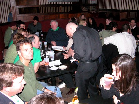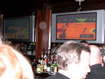 Can you think of a better place to celebrate St. Patrick's Day than an Irish restaurant? I went to Jake's Saloon. The place was packed with people wearing green, celebrating St. Patrick's Day and watching about 6 different NCAA Tournament Basketball games on the many flat screen TVs. Every table was filled, as well as the spaces between the tables. The patrons really got into the basketball games. At one point a group rooting for California started getting into it with a group rooting for NC State. No blows were exchanged but it got exciting for a moment. Actually, despite ample beer drinking (I had the house beer, the Jake's Ale) the crowd was rather well behaved. The atmosphere was lively and fun. I had a hamburger, which was just what I needed after a long day, and chicken wings, which had more than enough spice to wake me up. Service was friendly, and reasonably prompt considering there was almost no room to move. It just goes to prove that Jake's Saloon is a great place for special events.