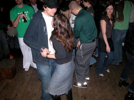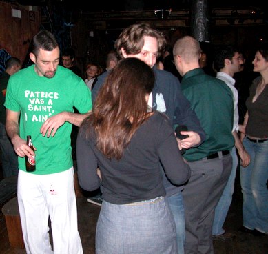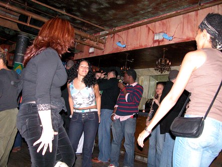 Joann Jimenez's party at The Sullivan Room (218 Sullivan Street, between 3rd and Bleeker) plays what is described as neo-Brazilian fusion (www.emergingarts.com/alma.html). I would describe it as a transitional social dance environment. The music played has a formal dance style that is associated with it. In this case, that style is Brazilian Samba. People can choose to dance in idiom, or if they just like to move, they can do their own thing and bop. When I got there around 11 pm (the party started at 10 pm), there were four women who had most of the floor to themselves. They were dancing true Brazilian Samba. They clearly knew what they were doing, threw themselves into the dance with abandon and enthusiasm and were a pleasure to watch. By about 11:30 pm more people arrived and the floor was packed. I would estimate that at this point half of the people were doing Brazilian Samba in a contained fashion (a legitimate and often necessary variant) and half were doing their own thing. There was even one guy dancing Samba wearing a St. Patrick's Day shirt.