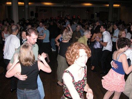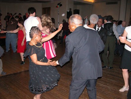 The New York Swing Dance Society held its dance in Manhattan at the St. Cyril and St. Methodius Croatian Hall last night, 502 West 41st Street, near 10th Avenue from 5:30 p.m. - 12:00 midnight. The space held hundreds of dancers with room to spare. The temperature was also comfortable -- you could either break a sweat if you are one of our more active dancers, or you could "chill out" in the seating areas, in the hallway, or near the entrance/exit.
