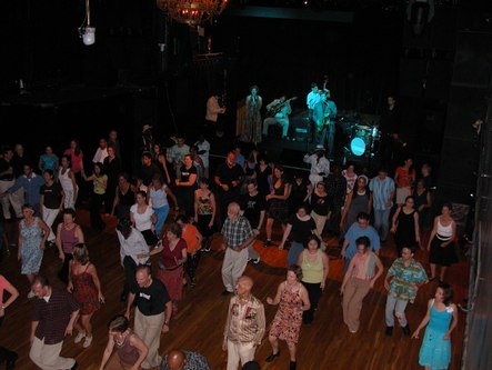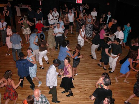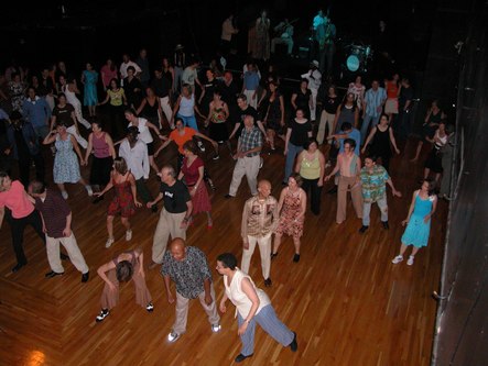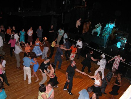 The New York Swing Dance Society puts on a fun Swing event one Sunday per month at Irving Plaza (17 Irving Place at E. 15th Street in New York City). They have a live band, which this time was Full Swing (sans Ron Sunshine who was sick). The music is mostly conducive to East Coast and Lindy Hop. A full bar is available. The hall is spacious and the floor is good. Admission is $15, or $11 for students, seniors and members of the Society. Doors open at 7 pm with a dance lesson from 7 to 8 pm.