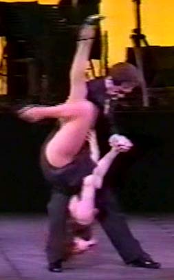 For our last example, I will cite a not-so-well know step performed by Norma and LuÌs Pereyra. The man and woman both did a double gancho with their right leg, jumped up, turned in the air and landed on their right knee on the floor. They then jumped up, turned, and repeated the step three times. This jump and landing on the knees is a very common step performed by men in Malambo dancing. LuÌs Pereyra was an excellent malambo dancer who danced for many years in the Ballet Folklorico Nacional of Argentina and the Ballet of MarÌo Machaco. It was a spectacular step to see in tango, but boy, did it hurt the knees!