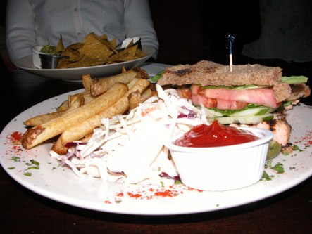 Robert Abrams and I had dinner at Jake's Saloon on 23rd street in New York City. I knew that name of the restaurant because I had seen it on ExploreDance.com. Jake's Saloon smelled good when we walked in. It gives you that Cheers feeling. I love the dÈcor, the old tin ceiling, the tiffany lights and the dark wood. Aaron, the waiter, remembered Robert's name from the last time Robert was at Jake's Saloon. Aaron used to work at Swing 46, and remembered Robert from there too. The service was fast and friendly, which was a good thing since we only had an hour between West Coast Swing dance classes and had to get from Dance Manhattan on 19th street to Jake's Saloon, have dinner and get back. The beer tasted good. Robert had the salmon, which he said had just the right amount of char to give it excellent taste. The salsa was very fresh. It was homemade with real cilantro. Jake's Saloon is a restaurant I would come back to.