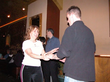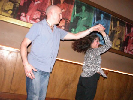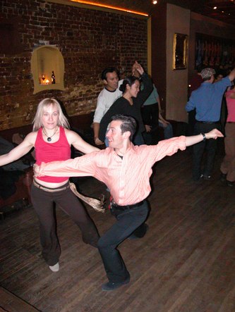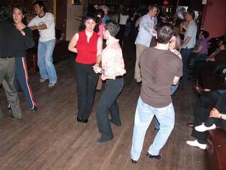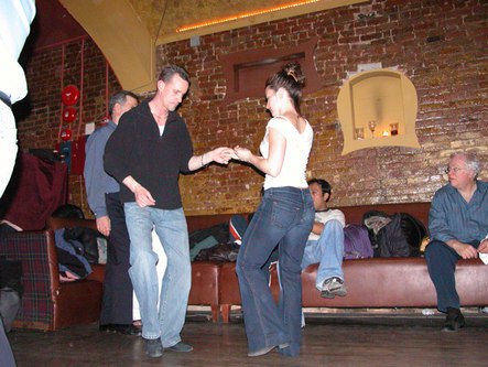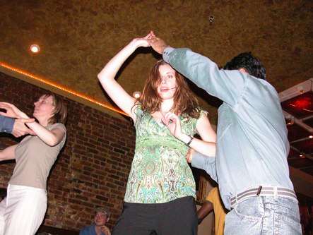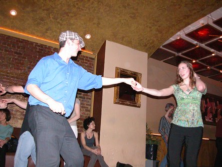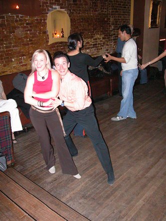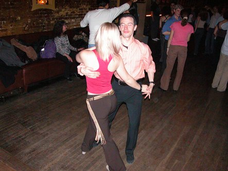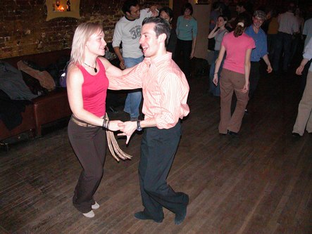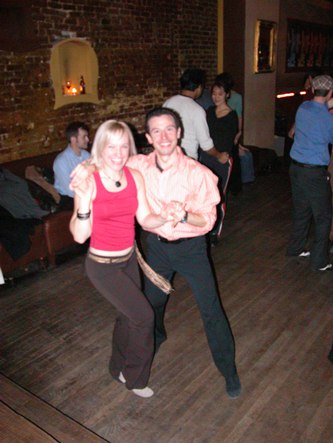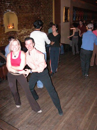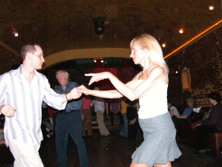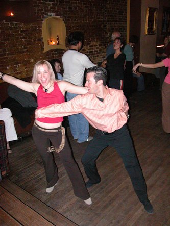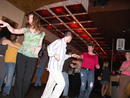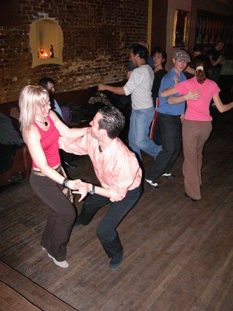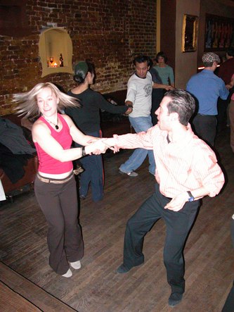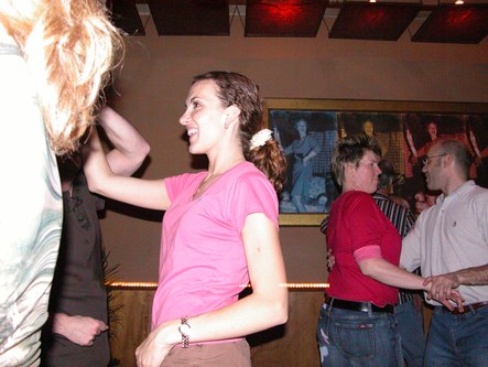 There was a great turnout at Chetty Red this Wednesday. Plenty of people to dance with, including some new faces, and yet still plenty of room to dance. The evening was also notable for a PinkTop sighting. When last seen, PinkTop, a pink Danskin racer back tank top with inner molded contour cup bra and black piping (style 5277, $38.00) that is made from 60% cotton, 35% nylon and 5% lycra spandex, was being displayed by Robert Royston, the 4 time US Open Swing champion. PinkTop has also been glimpsed in London at the Royal Ballet, and at The 100 Club, as well as on an Air France flight to Paris. This time we got the fabulous Swing teacher Autumn Bear to wear PinkTop during the revelries at Chetty Red. She was assisted by the dapper Erik Novoa, who was wearing a shirt from the Gap. You can see from the expressions on their faces that they are very happy to be dancing. We figure that part of that happiness is attributable to PinkTop. Not only do Danskin tops make the wearer happy, they make their dance partners happy too. You can see from the pictures that the other dancers this evening were happy too, just not as happy. Well made clothing, like pancakes, will tend to make people happy.