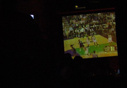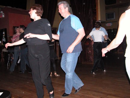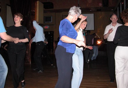 The regular West Coast Swing night in New York City used to be held at Jack Rose on Wednesday nights, until Jack Rose fell victim to unspecified economics and was acquired by a national restaurant chain (the one frequented by celebrity look-alikes). John Festa, who presented and DJed West Coast Swing at Jack Rose, has found a new venue. West Coast Swing is now on Tuesday nights at 99 Hudson Street, a sports bar in a part of town that seems to be threatening to become fairly hip. On this night, it happened to be the NCAA Women's Basketball title game, which UConn won over Tennessee. Dancing in what is normally a sports bar can provide food for thought on whether dance is a sport. I'll leave you to draw your own conclusions.
