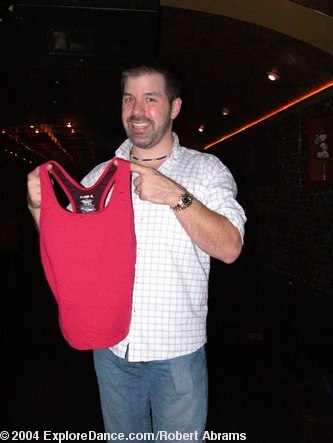 Robert Royston, 4 time US Open Swing champion, displays a pink Danskin racer back tank top with inner molded contour cup bra and black piping (style 5277, $38.00). In case you were wondering, this item is made from 60% cotton, 35% nylon and 5% lycra spandex.