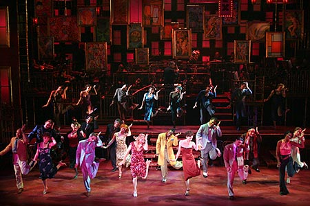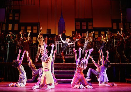 The orchestra is seated on the stage on a raised platform, much like in Chicago. The show starts with a lively and vibrant overture that sets the tone for the evening: you know you are going to have a fun time. The set is relatively shallow from front to back. It is layered with fire escapes painted a slightly tarnished, but golden, color in the foreground. The background is a silver, art deco rendering of the New York skyline. In between, a variety of latticework drops are lowered and raised as needed. The net effect does a good job of suggesting the density of the city.