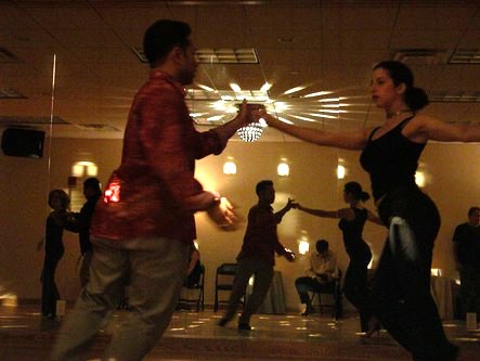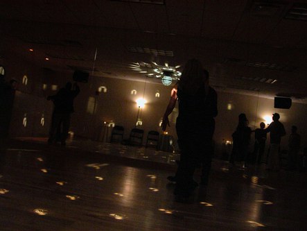 You Should Be Dancing has opened a new space at their studio. The new space is designed to look more like a night club and less like a dance studio. It has a polished, dark wooden bar with a real bartender standing behind it. The lighting played off of the golden-mustard colored walls to create an upbeat mood - bright enough to see but not with a "house lights" feel. There are even two high-tech disco balls that the DJ played with occasionally. The space was not quite done at this party, but so far so good.