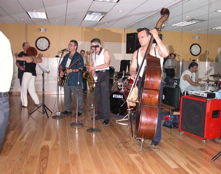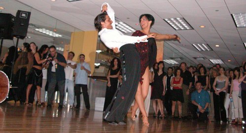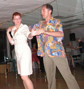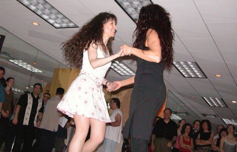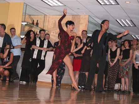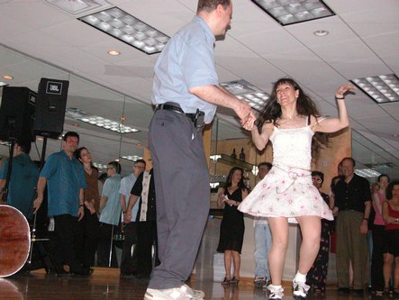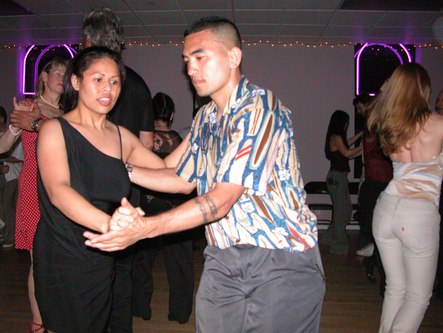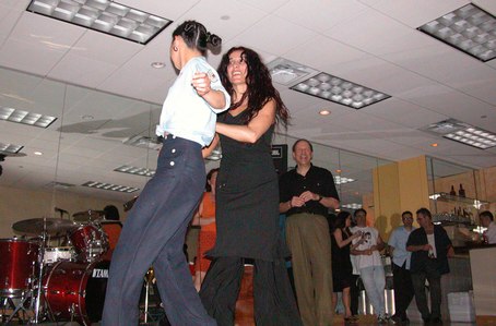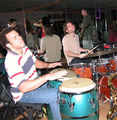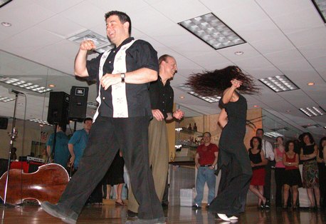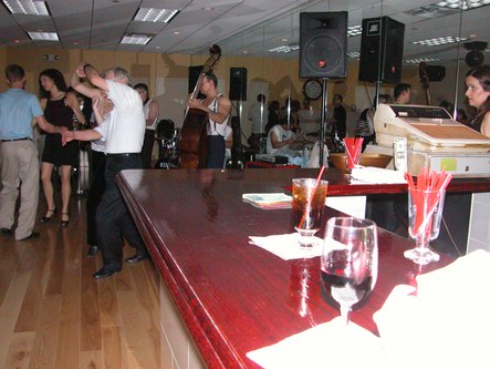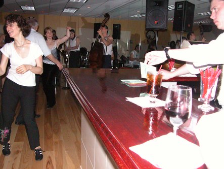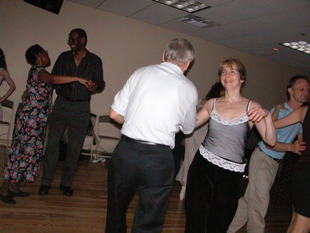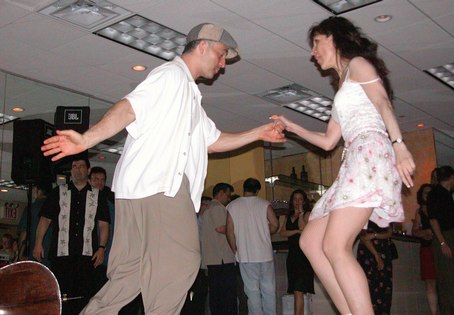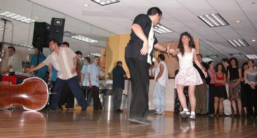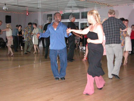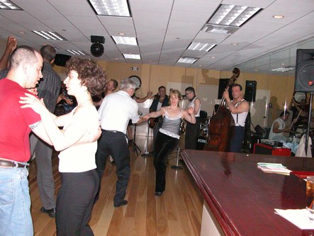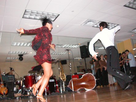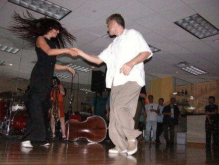 You Should Be Dancing has raised the stakes for social dancing in New York City. They have attracted sizable numbers of dancers for their past parties featuring a live band, but they have decided to make their offering even better. Tonight they offered two live bands, Afrodysia and The Cresent City Maulers, playing in two different rooms. Add to this West Coast Swing spun by DJ Anthony De Rosa in a third room, and you have a party with a diversity of dance styles not seen since The House of Latin Dance closed up shop. At any given point throughout the evening, at least two of the three rooms were quite full of energetic dancers. The live bands and the full bar with a real bartender make the space feel like a club. There were a number of performances too, so it was a very full evening.