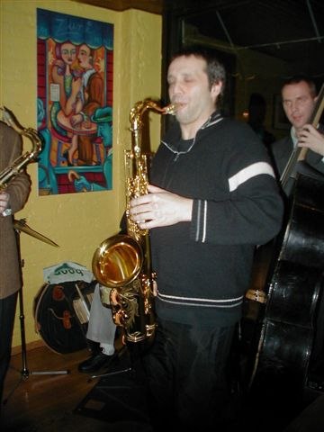 Zuni Restaurant, in the heart of the Broadway Dance and Theater district, is decorated with colorful paintings of jazz musicians, all painted by Elizabeth Rosen, and they're for sale. Harry Allen - Joe Cohn Quartet appears there every Monday night, 8 PM - 11:30 PM, and they invite many guest artists to join the music, with jazz generosity, in an effort to support the local and international music community. When musicians are in town, they can be seen, on occasion, jamming with Harry, Joe, and the band.